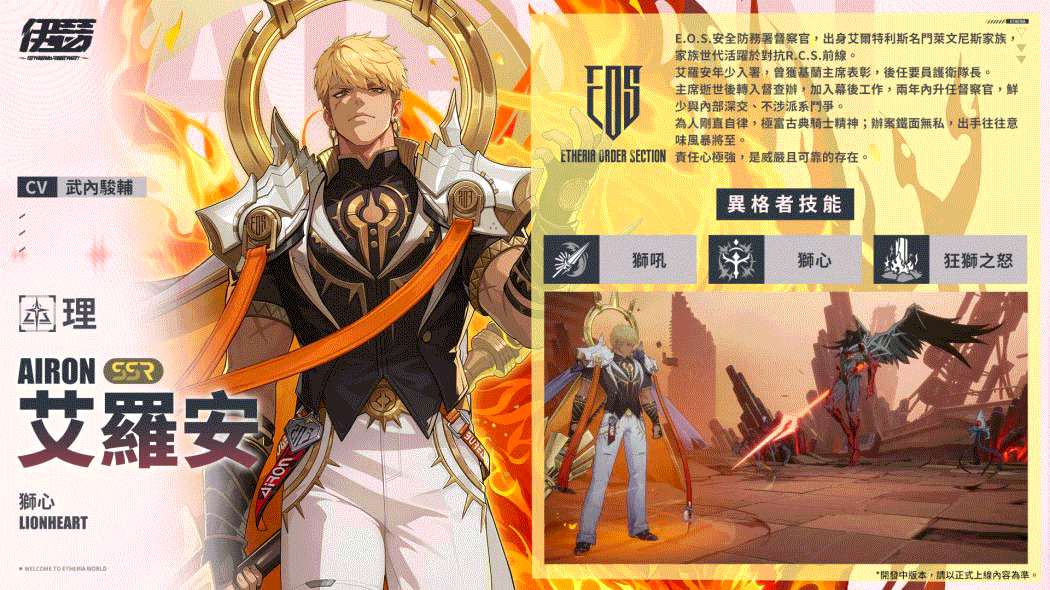 「艾羅安」是一名兼具防禦與輸出的異格者,能透過轉移增益與減益效果,為團隊創造更多戰術空間,扭轉戰局。其大招可對敵方單體造成傷害,並將擁有「護衛」的友方減益轉移至目標,同時有機率偷取敵方行動進度,打亂節奏、掌控局勢。